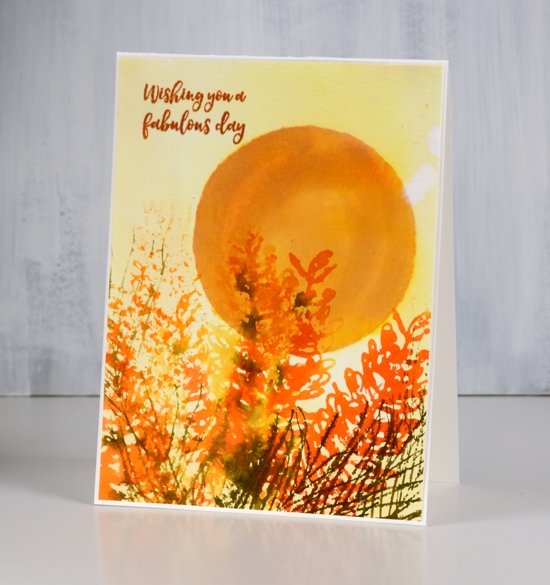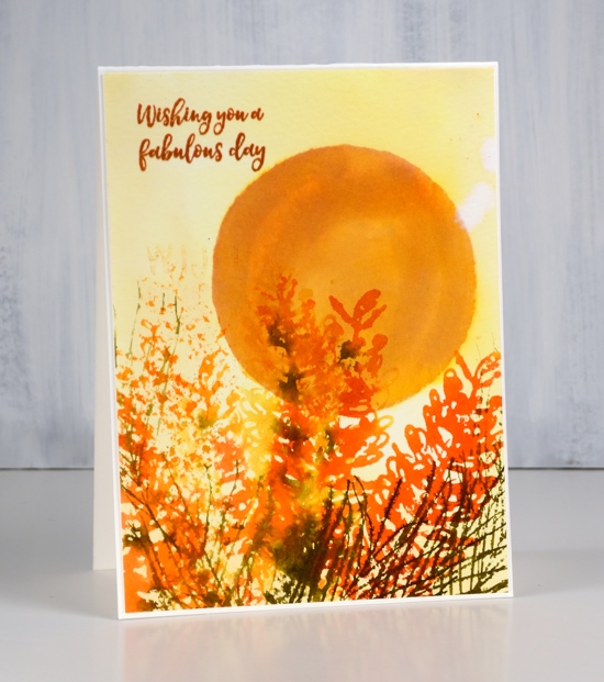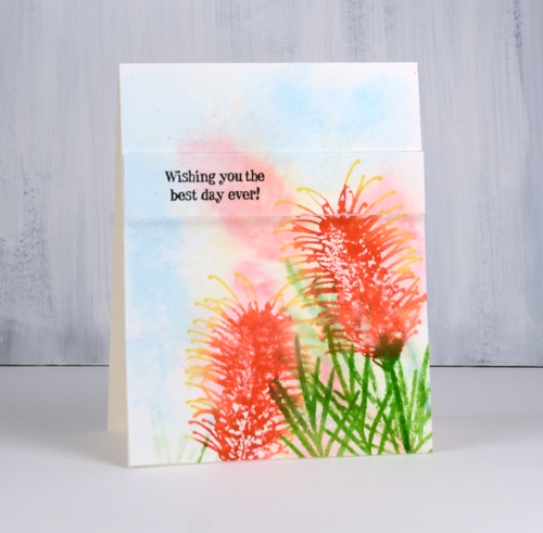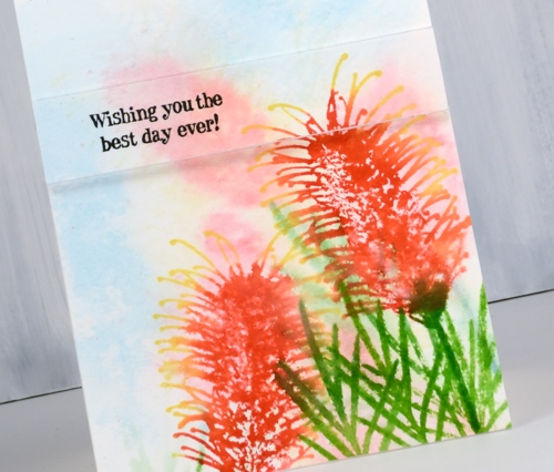 I wanted the foreground images to be sharper so I dried the panel with a heat tool. In order to keep the tips of the grevillea yellow and the rest of the styles red, I stamped first in yellow then in red but I wiped red stain off the ends. I used one of the foliage stamps and inked it with two greens for a more realistic look. I spritzed ever so slightly to make the inks blend a little but not so much as to loose the definition in the detailed stamp.