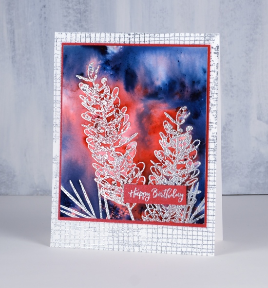 For a background I stamped mesh textures stamp four times on white card base with versamark ink (you could use mesh background stamp if you have it to fill card base) and embossed in silver. I stamped a sentiment from happy birthday sentiment strip in versamark on red cardstock and embossed it with silver powder. To complete the card I matted the grevillea panel with red cardstock and attached it to the card base.