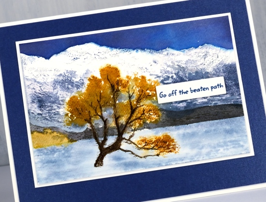 My autumn Lake Wanaka panel features the main tree and stand of trees in fossilized amber ink. I inked most of the stamp with a stormy sky marker but avoided the tree so I could use a fossilized amber marker to ink the foliage. I wanted to leave snow on the mountain tops so I did very little to that area but painted stormy sky and chipped sapphire shadows further down the mountains. Once again I painted the foothills in black soot ink. I used diluted stormy sky ink for the lake and chipped sapphire for a bold sky. When I was stamping the tree I spritzed the stamp to help the fossilized amber ink spread further.