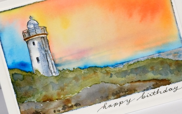 Posted: April 16, 2018 Filed under: lighthouse | Tags: Darkroom Door stamps, Ranger Distress inks, Ranger Distress stains 19 CommentsToday’s card has been sent to my dad for his birthday but considering the time it takes for mail to get from Canada to Australia these days and my own postal disorder it did not arrive in time. He is currently visiting my brother so this post provides a sneak peak before the real thing arrives in his mail box. Happy Birthday, Dad! I chose this stamp from Darkroom Door for several reasons. When I first visited Darkroom Door in 2016 I enjoyed visiting and talking with the owners Rachel and Stewart. When my dad returned to pick me up he walked in, looked at all the DD stamps displayed and was drawn to two stamps in particular; this was one of them. During the same 2016 trip Dad and I went to the Norah Head lighthouse, featured on this stamp and not too far from my parents’ home. We went for a quick look and discovered there was a guided tour about to start so we joined in. We heard the history of the light and enjoyed the views from several vantage points.