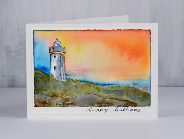 To paint this scene I stamped the scene in distress inks, the top border, sea and light in stormy sky, the land around the light in forest moss and the foreground rocks in black. I then used stains to paint the scene; I’ve listed them below. After painting I used a fine tip micron pen to re-draw the railing and details on the light then wrote a sentiment.