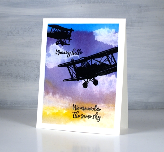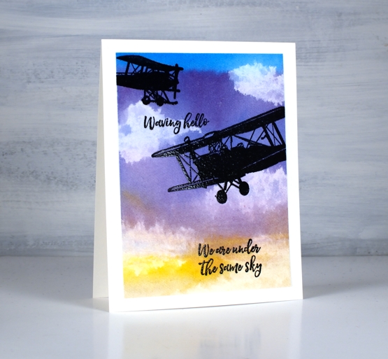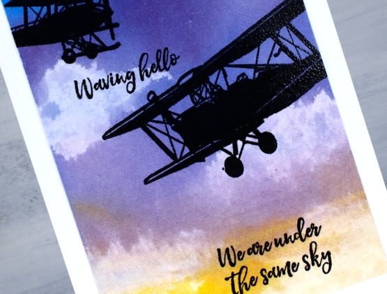 After pairing the cool new ‘long distance’ sentiments from Darkroom Door with a map stamp I took another look at the strip of sentiments (there are eleven) and picked out a couple that would work with planes and a sunset sky. I must admit my matchy-matchy side was pretty happy these two sentiments are in the same font and the three on my map card were also in the same font.