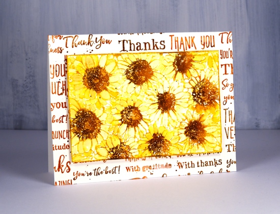 I tried a woodgrain background but it was too dark. By choosing to stamp the ‘thank you’ sentiment strip several times more of the cream background showed through. I inked the sentiment strip in vintage photo and rusty hinge distress inks and spritzed it lightly before each print. The result was blended and sometimes smudgy words. I gave both the flower panel and the background the splatter treatment then popped the gerberas up on a foam rectangle.