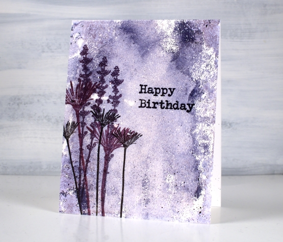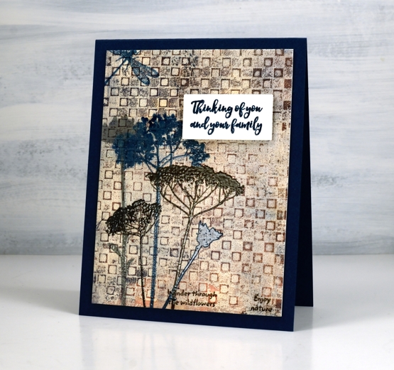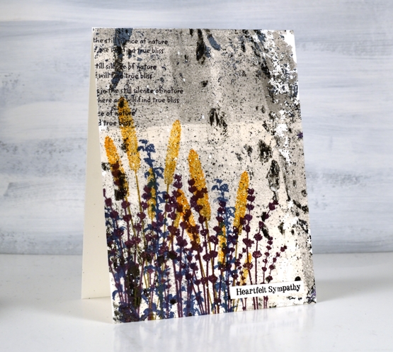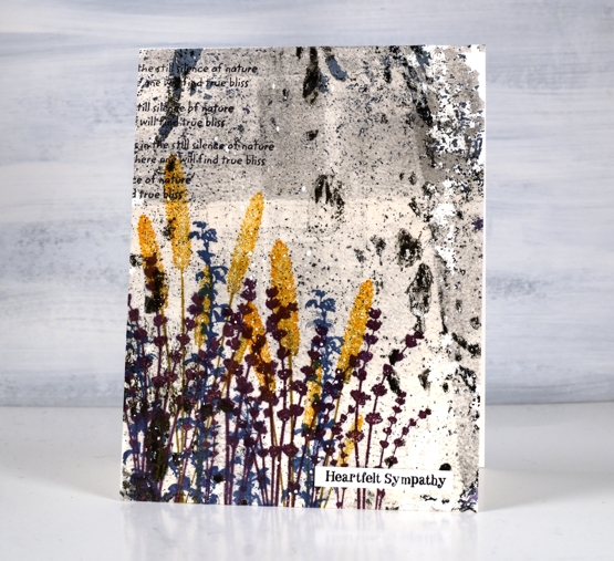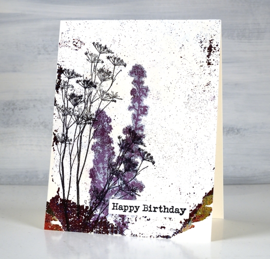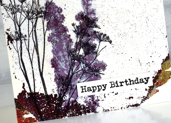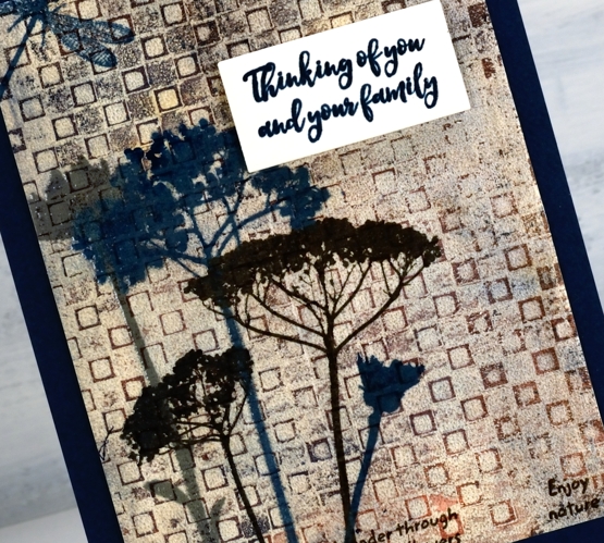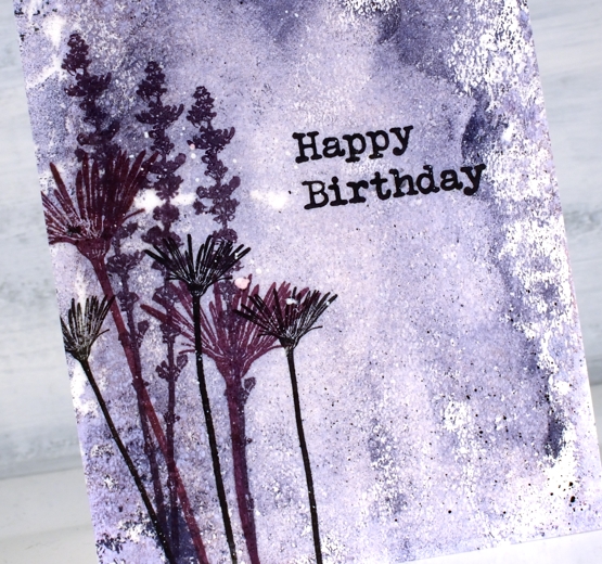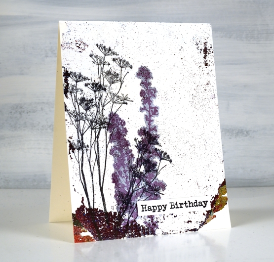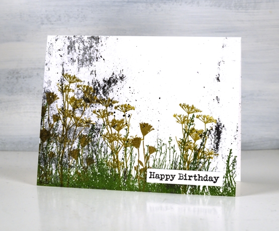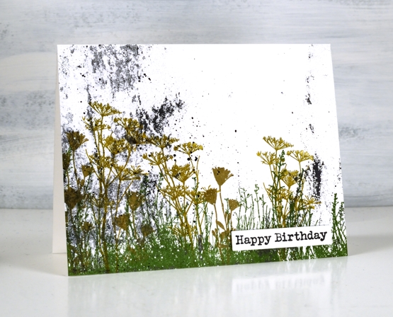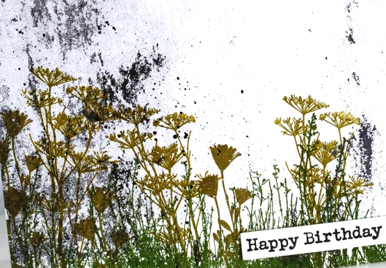 The only colour on the background print above was some black. I used rustic wilderness, wild honey and frayed burlap archival inks to stamp flowers and grasses from Darkroom Door sets, nature walk and wildflowers vol 2.