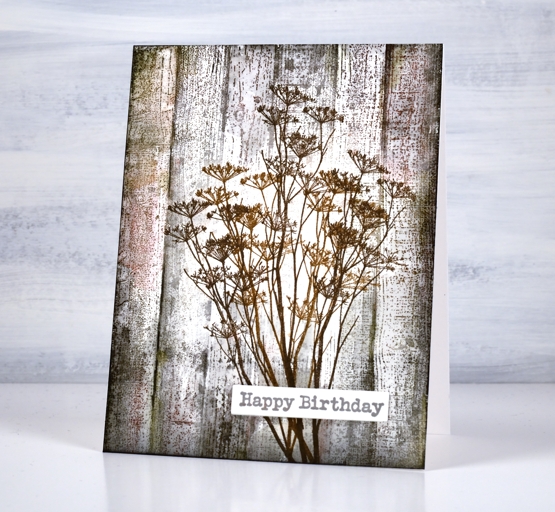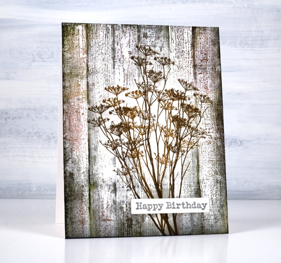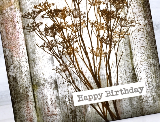 For this wintery image of dried stems against aged wood paneling I stamped the flower stems from Darkroom Door’s ‘nature walk’ first in brown archival inks so they wouldn’t blend when I worked on the background. I stamped the DD ‘woodgrain’ stamp over the top first in hickory smoke distress ink then a few more times adding black soot, forest moss and barn door distress inks. I blended as sparingly as I could to retain the texture of the stamp.
