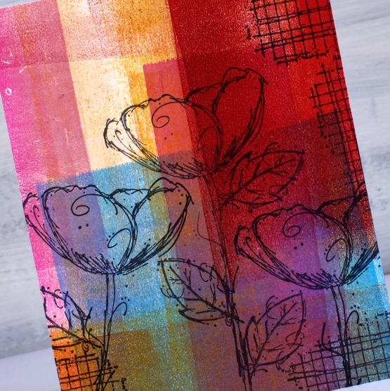 On the print above you can see not only the specks of black paint from the plate but also the leftover paint from the border of the plate. Most gel printers love being able to pick up some of those colourful leftovers on a future print.