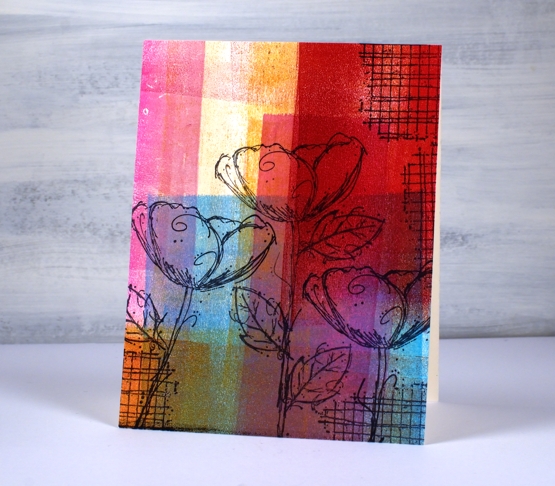 Another gel print post? Yes indeed, and no apologies. If you have tried gel printing you will know it is a little addictive. Today’s post features cards stamped with Darkroom Door flowers. Some are stamped on clean up sheets, others on gel prints. A clean up sheet is thick drawing paper I keep at the right of my gel plate for rolling excess ink off my brayer. As you can see in the panels above and below I can end up with some very colourful sheets.
