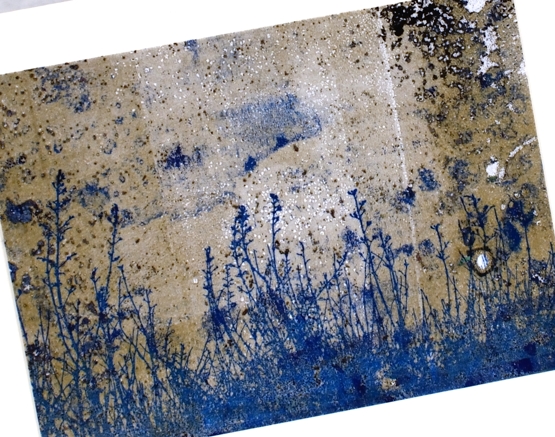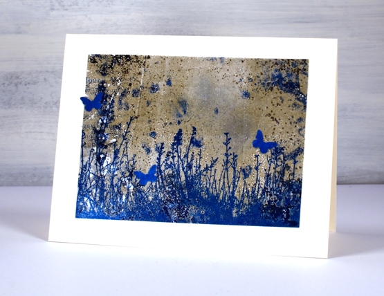 The last two cards are made from gel printed panels not clean up sheets but are very distressed. The print I pulled and cut up to make a couple of garden cards include plenty of distressed texture from a printing session including a little bit of text.