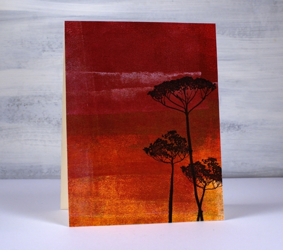 The original gel print was done on a 9″x11″ gel plate so there was enough print for two cards and some extra strips on the envelope flaps