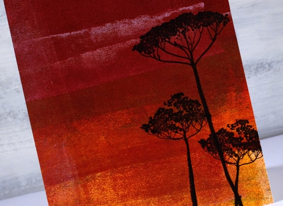 This deep red background is also a clean up panel. I am always excited to see landscapes or skies appear in an abstract print or clean up sheet. Those two strips of white added a hint of clouds to a very bold sunset! I stamped the silhouette flowers from the DD set, wildflowers vol 2.