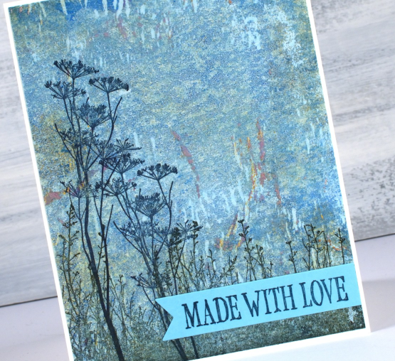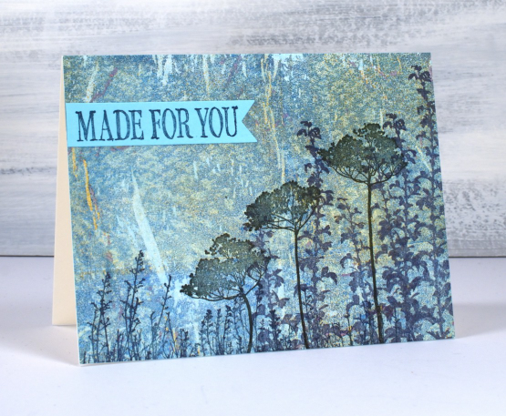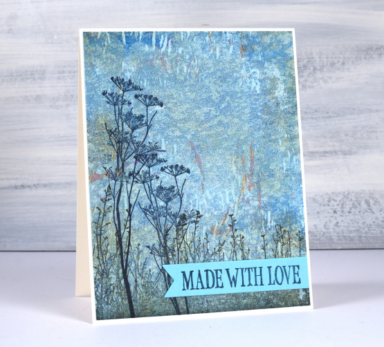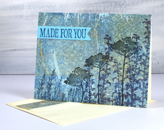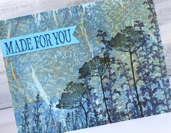 I used Ciao Bella chiascuro ink pads, the colours are deep but muted and worked beautifully with the paint colours in the gel print. Because rice paper is somewhat transparent I adhered the panel to a piece of aqua cardstock which made the print look bluer. I used the same cardstock to stamp the two phrases from the new DD ‘made for you’ set of label stamps.