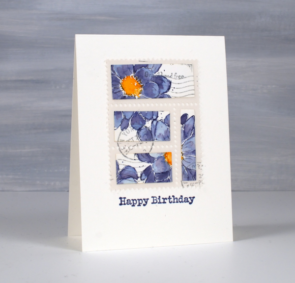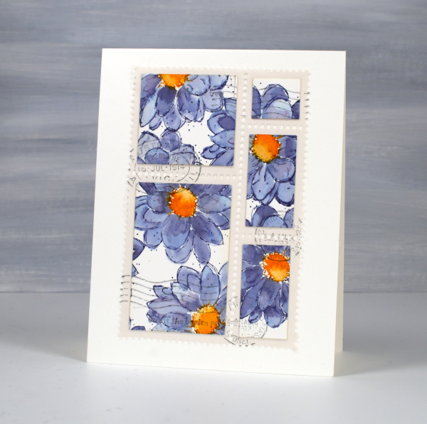 Recently I created some faux postage stamps from a stamped and watercoloured panel. I pulled out another floral panel from my ‘pile of possibilities’ and filmed myself making some more faux postage stamps to feature on cards. The watercoloured panel features a repeated flower from the Darkroom Door set, ‘fine flowers vol 2’ and there is a video of my watercolouring process for that too.