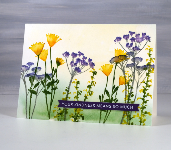 This card is a sample from my Floral Faves online class. In the class I feature no-line watercolour with outline stamps, techniques with brushstroke stamps and ways to use silhouette stamps as featured on this card. I often use my silhouette stamps with a black or dark ink over a sunset sky but I do like to give them colour sometimes with a pale watercolour wash in the background.