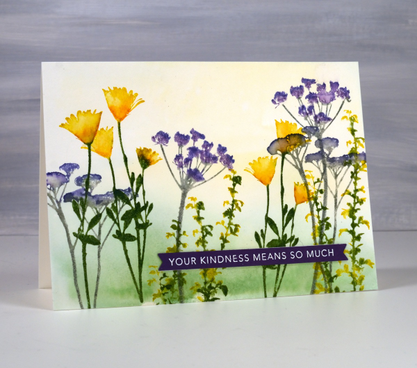 These spring flowers are all silhouette stamps from Darkroom Door, some from the Nature Walk set and a few from Wildflowers vol 1 & 2. Even though the stamps are solid with no detail it is possible to use ink pads and markers to give them more depth.