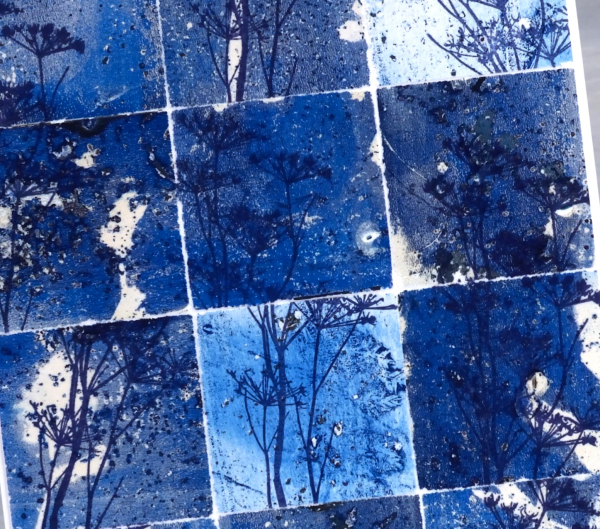 To create this collage of blues I tore a couple of partial prints into squares and stamped the delicate stamp from Darkroom Door’s nature walk set at different angles on the the squares. I put these ‘scraps’ back together and the partial prints brought shades of blue, pops of white and bits of pattern and texture.