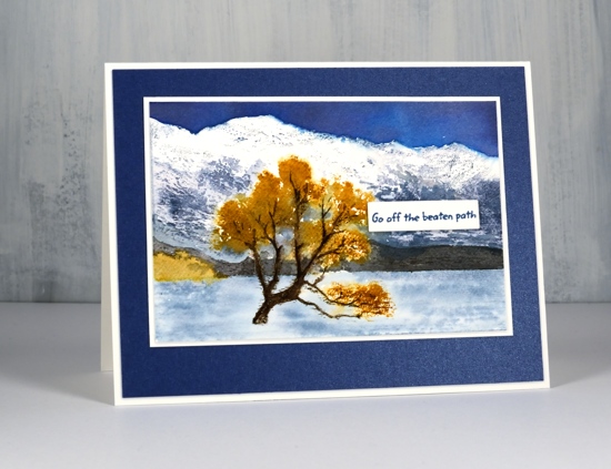 My autumn Lake Wanaka panel features the main tree and stand of trees in fossilized amber ink. I inked most of the stamp with a stormy sky marker but avoided the tree so I could use a fossilized amber marker to ink the foliage. I wanted to leave snow on the mountain tops so I did very little to that area but painted stormy sky and chipped sapphire shadows further down the mountains. Once again I painted the foothills in black soot ink. I used diluted stormy sky ink for the lake and chipped sapphire for a bold sky. When I was stamping the tree I spritzed the stamp to help the fossilized amber ink spread further.