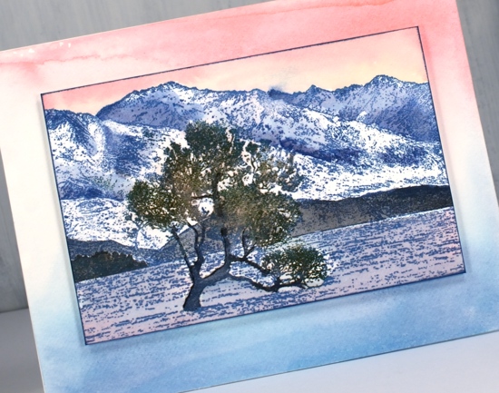 For this first summer scene I worked with a hot pressed watercolour panel in my stamp positioner because I knew I was going to add inks step by step. I started by inking the lower (lake) portion of the stamp with stormy sky distress ink and the top portion of the stamp with tea dye distress ink. Next I worked with forest moss marker and ground espresso distress markers to add colour to the tree. This took a little while as the tree is made up of fine detail so I was only transferring a little ink at a time. Once the tree was defined I painted the lake with stormy sky and weathered wood ink. (smooshed onto my glass mat – I know you’ve probably got that step by now!) I switched to earth tones to paint the mountains and followed some of the definition of the stamp with rusty hinge, frayed burlap, vintage photo and tea dye inks. I painted a little stand of trees in the left corner with forest moss ink and added some reflections in the water. Once the mountains were dry I painted the sky with weathered wood, stormy sky and faded jeans ink.