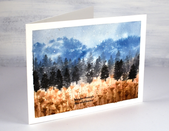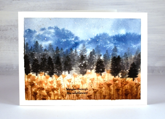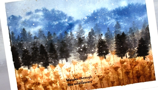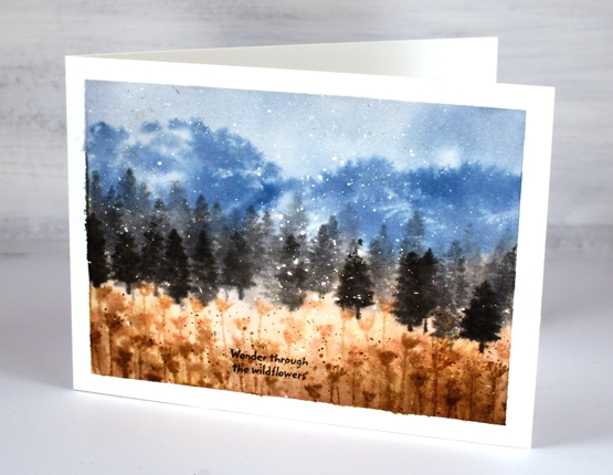 While the whole panel was wet I stamped the large mountain stamp from DD ‘majestic mountains’ in faded jeans ink then, after a pause, the small trees from the same set in ‘hickory smoke’ then. after a longer pause, in ‘black soot’ ink. I used a small floral stamp from DD ‘wildflowers vol 1’ to stamp and restamp flowers in the foreground, first in ‘tea dye’ then in ‘gathered twigs’. I dried the panel rather than wait and finished it off with tea dye and gathered twigs splatter.