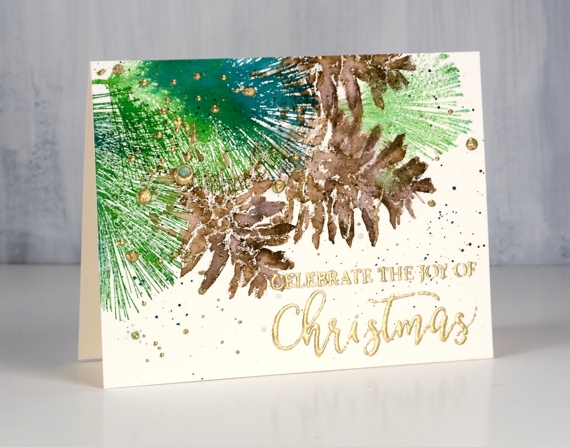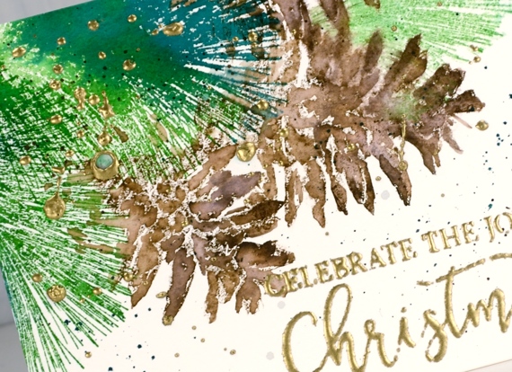 For the second card I switched pine needle stamps but kept the same pine cone. I stamped the needles first in mowed lawn and pine needles distress ink. Again I didn’t want to cut some fiddly masks so I did partial inking instead to position the pine cones in amongst the needles. I blended them with a fine tip paint brush then splattered some green and brown inks over the panel. I wanted a splash of gold so I embossed a sentiment from Yuletide greetings in ultra high gold embossing powder which is chunkier than some.