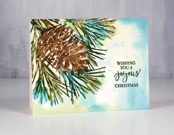 I stamped the pine cone three times using a stamp positioner and four different brown distress inks. A spritz of water started the browns blending and I did a little blending with a paint brush as well.