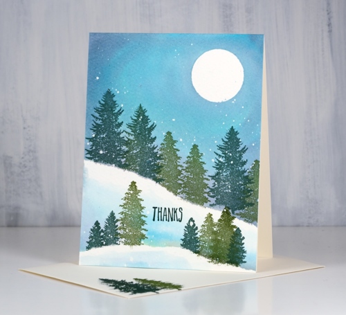 Posted: December 12, 2018 Filed under: majestic mountains, pine cones | Tags: Darkroom Door stamps, Ranger Distress stains, Tsukineko Memento inks, Tsukineko Versafine inks 11 CommentsI pulled out the wonderful new trees from Darkroom Door’s ‘majestic mountains’ set to create today’s cards. I wanted to create two forest scenes, one on a crisp cold night, the other on a misty day. There are some similarities in the techniques and inks as well as differences which enabled me to create both looks. I began both times with cold pressed watercolour paper splattered with masking fluid. I like to have a few circles cut from frisket film on hand to mask a moon so I positioned one in the top right corner then tore a post-it note and positioned it diagonally across the panel. I stamped the two larger trees in versafine clair inks along the edge of the post-it mask so the trunks did not show and used one green for the largest tree and another green for the smaller.