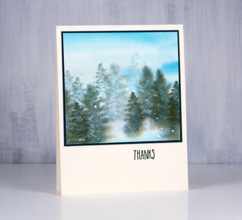 Next I removed the post-it mask and painted water along the lower edge of the stamping and upwards to fill the sky. Then while the paper was wet I added weathered wood, faded jeans and old paper distress stains to fill the sky. Once I had the sky blended I used the post-it mask again as an edge to stamp more trees including one of the smaller ones from the ‘majestic mountains’ set. Again after removing the post-it mask I painted water and blended some of the three stains into the water to create shadows behind the trees and snowbanks. To finish it off I dried the panel, removed the frisket film and masking fluid then added a sentiment from the DD ‘pine cones’ set.