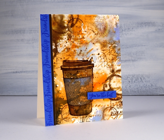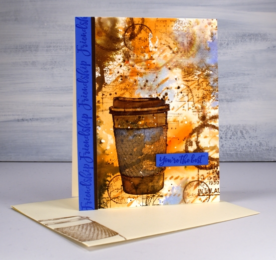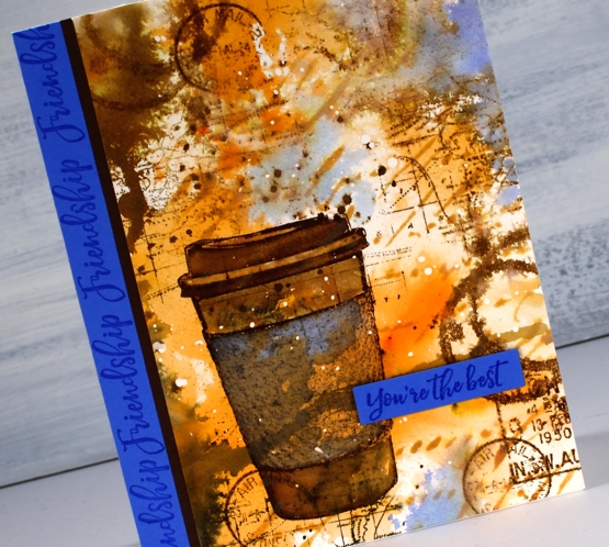 Unfortunately the coffee cup did not stand out enough from the background and the background itself looked incomplete. DD world map stamp and blueprint sketch distress ink came to the rescue. I stamped the world map several times on the panel in gathered twigs ink and then, to break up the orange and brown monopoly, I added some blueprint sketch ink in just a few places. I found some blue cardstock that matched the blue and stamped ‘friendship’ and ‘you’re the best’ from the DD ‘friendship’ strip of sentiments to finish the card. Oh, and I added a thin strip of brown cardstock separating the blue from the patterned panel.