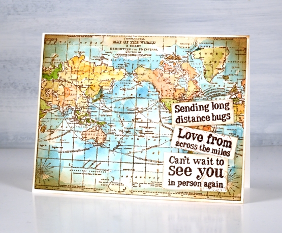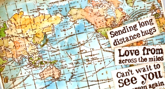 As many of you know I am originally from Australia and all my family still lives there while my husband, children and I live in Canada and have done for twenty years. When I designed this card featuring the DD ‘world map’ stamp I did so with my Australian family and friends in mind so I had to make sure both countries were still on display after I added the sentiments. I stamped the map on hot pressed watercolour paper in tea dye distress ink and acorn versafine clair, dried the inks then started painting colours over the map. I smooshed tea dye, carved pumpkin, abandoned coral, broken china and mowed lawn distress inks on my glass mat and painted loosely with no major concern for borders or accuracy. I searched ‘antique map’ for an inspiration photo to guide me.