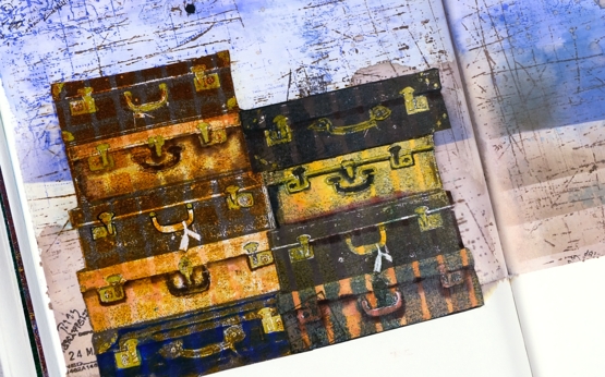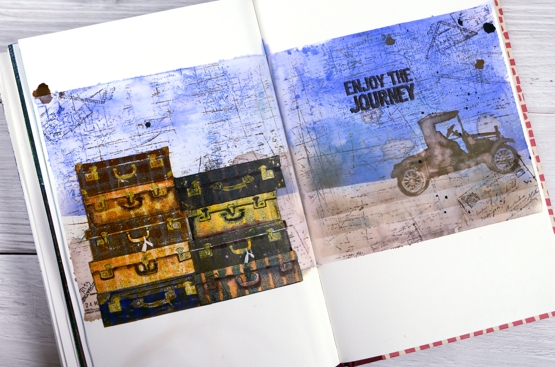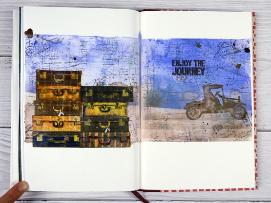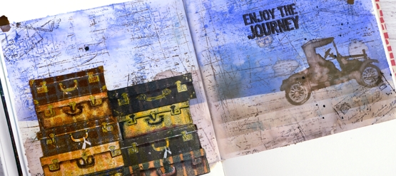 To add even more vintage-ness to the vintage suitcases I stamped them on a grid and striped prints from the gel printing session. I used corrugated cardboard to make the patterns on the gel plate originally. I stamped the suitcases in archival inks then added extra colour with distress inks and gel pens. To create the background I smooshed blueprint sketch distress inks on a piece of acetate, spritzed water over the ink then transferred it to the masked journal pages. With the blue protected I blended a brown base, also with distress inks. Over the top of the inking I added some impressions with the DD world map and scratches background stamps. To balance the suitcases I added the vintage car and sentiment on the right hand side.