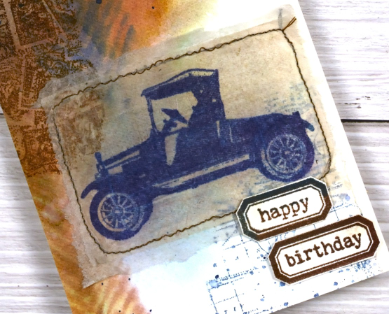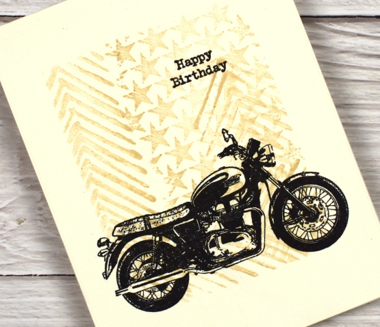 You’ve seen me use the ‘this way’ stamp behind a trio of butterflies and a classic car as well as featured on a journal page. It reminds me a little of tire tread so I have paired it again with some vehicles. For this motorbike card I masked the edges of a cream panel and stamped ‘this way’ and ‘brushed stars’ in antique linen distress ink.