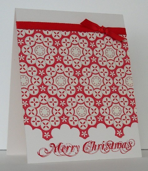 Posted: November 6, 2010 Filed under: CAS, Designer Paper 1 CommentI know there are limited supplies challenges around the place but this card isn’t for one of them. I have a friend at church who got into stamping through me and wanted some ideas for Christmas cards. She brought her supplies to me and I said I would come up with a few ideas. She had cream and real red card along with a old pack of Cerise dp, a favourite of mine. Her plan is to stamp some Christmas cards with the two girls she cares for each day after school. I came up with some designs which are not too difficult. The challenge for me was sticking to the supplies she had in her bag. I couldn’t do it; I had to dip into my stuff now and again for a punch or sentiment. The card above was inspired by this CAS beauty, which was in turn inspired by this one!