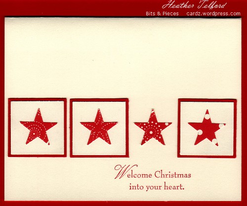 Posted: October 27, 2009 Filed under: CAS, Designer Paper, Uncategorized 2 CommentsWhen I saw this card on Susan’s blog I knew it would be perfect for the Christmas Card workshop I did for the ladies at my church on Saturday night. There is plenty of room for creativity with three pretty squares and “merry & bright”. Some women are happy to create the cards exactly as I designed them. Others like to change it up a little.