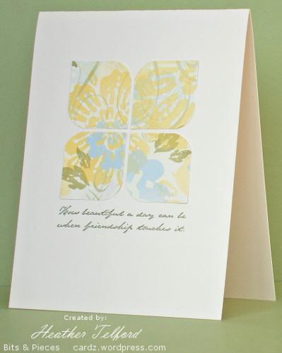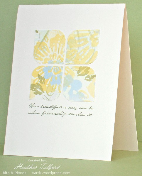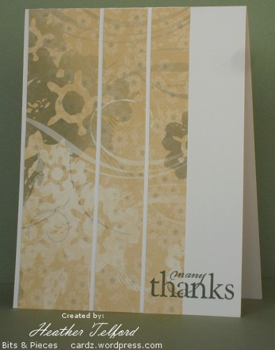 Posted: July 25, 2010 Filed under: CAS, Designer Paper 4 CommentsClean & Simple are celebrating their 100th sketch challenge. I often have trouble with sketches but when one works for me it can become a favourite. which I revisit again and again. For this one I pulled out the remnants of one of my all time favourite packs of SU Designer paper. To make the scalloped edge I cut around the design on the paper. The sentiment caused me a little trouble as it wasn’t inked adequately the first time. I used the stamp-a-ma-jig to restamp but was off by a bit. As my designer paper was already stuck down I decided the double font looked just fine (even though it now looks totally out of focus!)