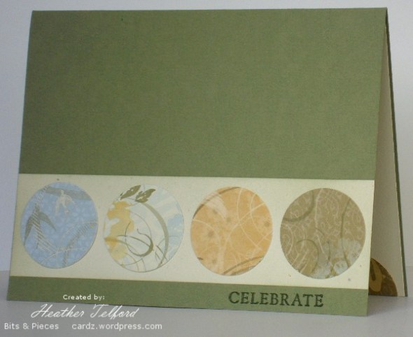 In the second card I wanted to make the most of the lovely design on the paper without doing much to it; splitting the panel achieved the effect I was after. The card below started out on ivory with a portrait orientation but it suffered a nasty sentiment placement accident and underwent fairly drastic surgery before emerging as the card you see below. I have repeated the four circles inside the card but with halves instead of whole.