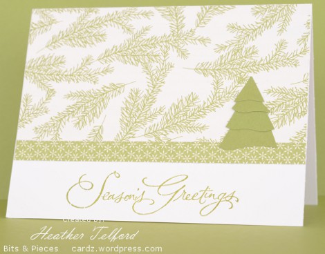 I made these two cards a little while ago after several weeks of no card making. Sometimes when I have had a break from stamping I need someone else’s ideas to inspire me. The card above was inspired by one I saw in Sharon Johnson’s 12 Days of a CAS Christmas. Sharon’s cards are so elegant and refined. My tree is cut out of scraps, layered and popped up.