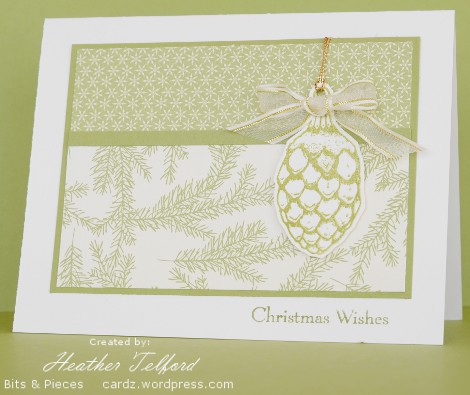 The card below was inspired by a lovely Christmas card Susan Roberts designed. Susan is such a clever stamper who amazes me by trying and mastering so many different techniques and styles. My pine cone is trimmed closely and popped up.