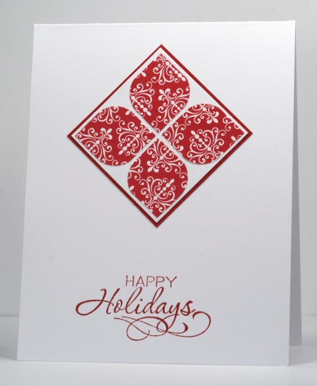 Posted: September 4, 2012 Filed under: CAS, Designer Paper, Penny Black 3 CommentsPenny Black has a new pad of designer paper with all sorts of designs perfect for fall, winter and more. I pulled out a red and white print to make a Christmas card and two leaf prints plus a check to create a fall wreath card. I used a recollections leaf punch to create the fall wreath. The red and white print reminds me of Scandinavian patterns. To create the square I cut four identical squares then used a corner rounder punch on two corners of each square.