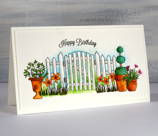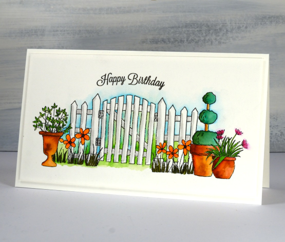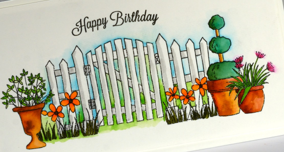 This little front fence is a new digital stamp from Echidna Studios. It’s a set of five images that you can arrange yourself. Each image is opaque (or stackable) which means when you arrange them before printing you can put the plants in front of the fence and in front of each other. The five stamps are the fence, the triple topiary, the flowers in the grass, the flowers in the pot and another pot not featured on this card.