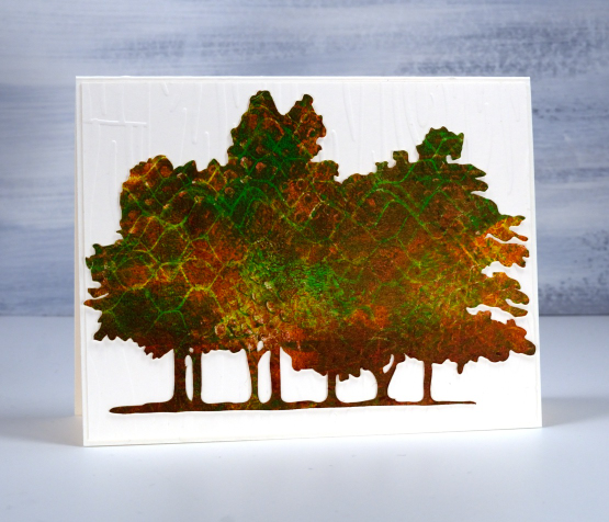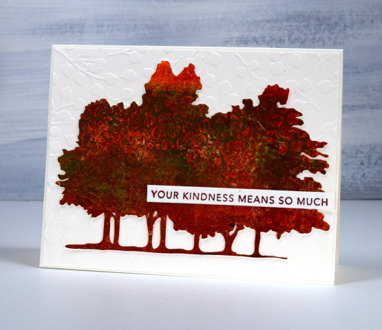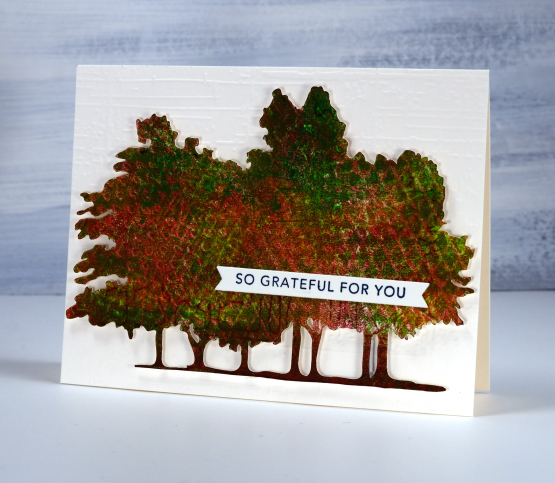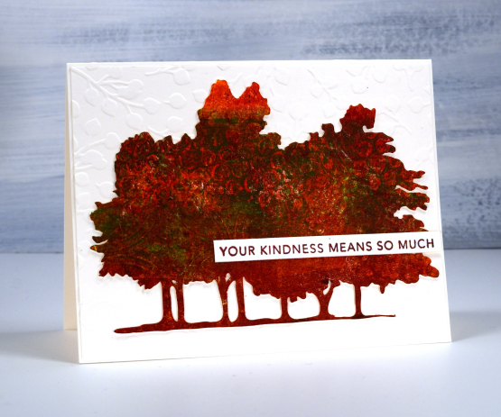 The print below is also featured in the video. I thought it would be fun to print leaves onto the Mooneys Trees cut out. I used the digital cutting file to cut from cream cardstock then picked up the leaf print from the gel plate. My new timber embossing folder from SU was the perfect background.