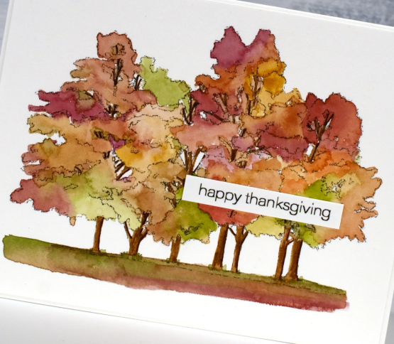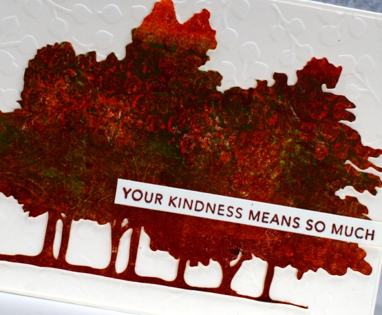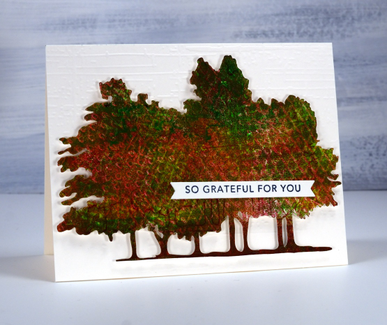 The two sentiments are from Taylored Expressions ‘simple strips background stamp‘ which stamps 18 sentiments to be cut out with the co-ordinating die. I really enjoyed making cards featuring local trees which are changing colour right now and of course I loved gel printing the cutouts to look autumnal.