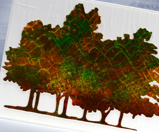 All the trees featured in this blog post were made by printing three layers of paint on top of each other, letting the paint dry in between layers. I varied the paint colours and texture on each layer. On the card above you might be able to pick out bubble wrap and textured cardboard patterns.