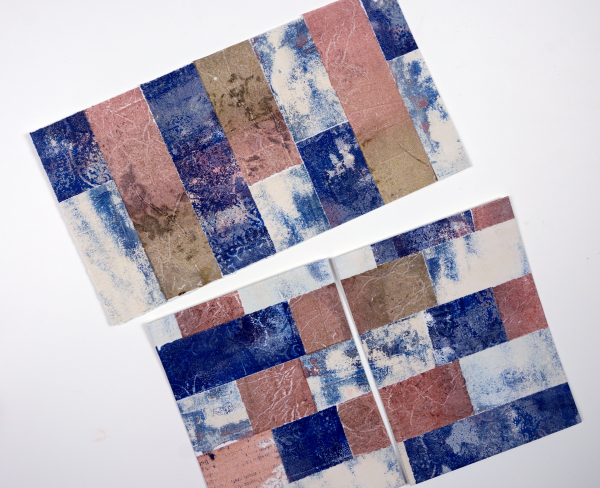 Unsurprisingly I have built up quite a supply of gel prints. Recently I turned a bunch of them into collaged panels. You can see in the photo below the simple collage I created by gluing torn strips of three different prints in a brick-like arrangement. To make things easy I tore the strips the width of my ruler so they are all 1¼” wide.