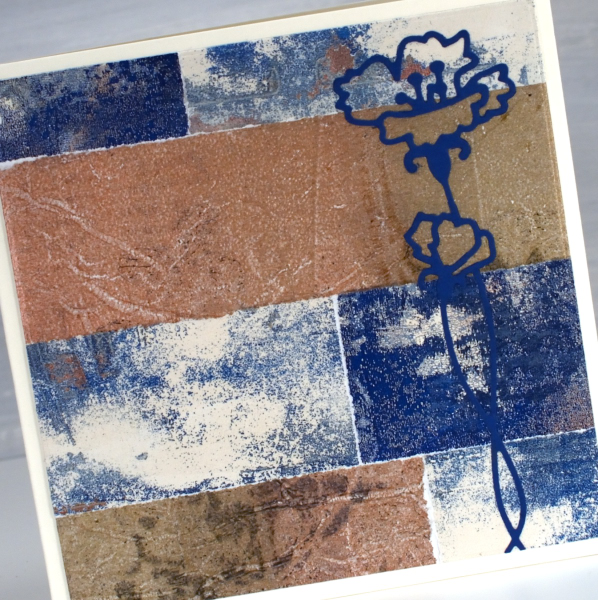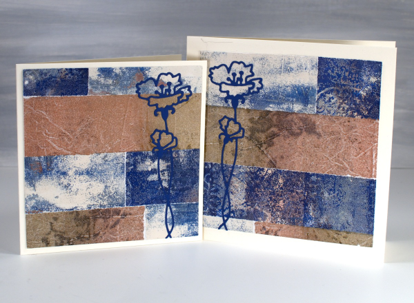 I was able to cut two smaller square panels which I also make into cards featuring the Penny Black die, ‘harmonious’. When you look at the gel prints themselves they don’t look all that fancy but when combined this way I really like the play of colours and textures.