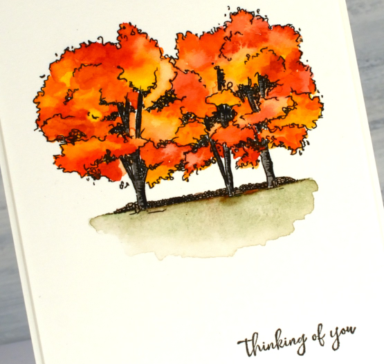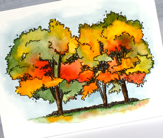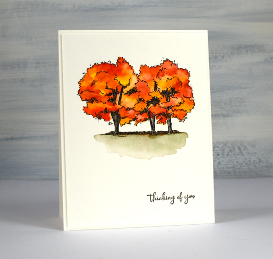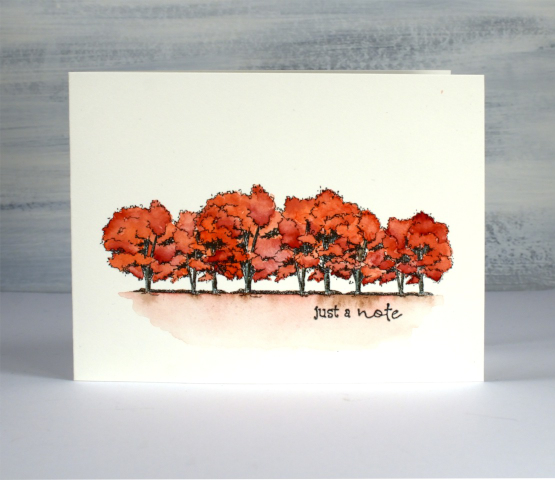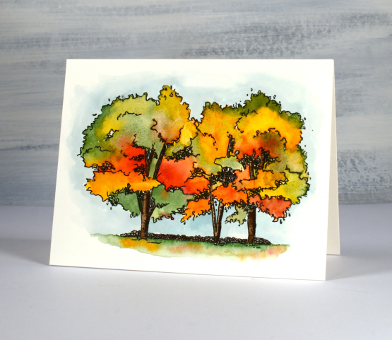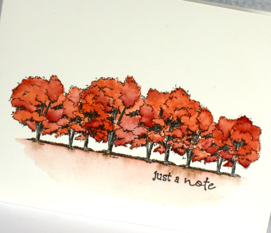 I printed all three panels on hot pressed watercolour paper and painted them with Sennelier watercolour paints. The tree image above is 3.25″ wide, popped up on a card base with a Penny Black sentiment added in black ink. I printed the trees larger, 4.75″ wide, on the landscape oriented card below, painted them again with Sennelier watercolours then added a pale sky background with diluted speckled egg distress ink.
