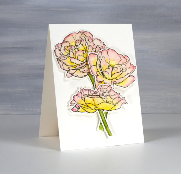 The tulip festival officially started here in Ottawa on Saturday but definitely not in my yard. There are potential blooms on a few lonely tulips but nothing looking showy or colourful yet. It doesn’t matter how many I plant, most do not shown up the following year! The tulips on today’s card are from Echidna Studios, the ‘tulip background digital stamp‘ printed on hot pressed watercolour paper.