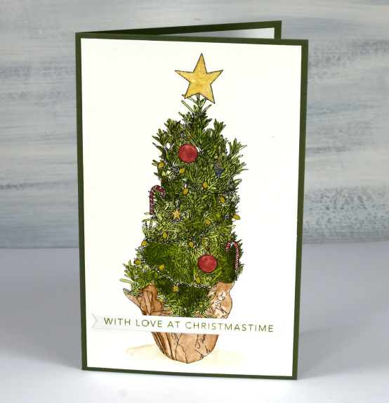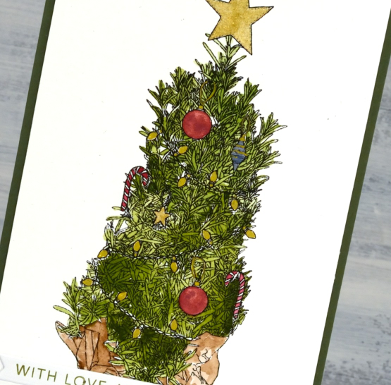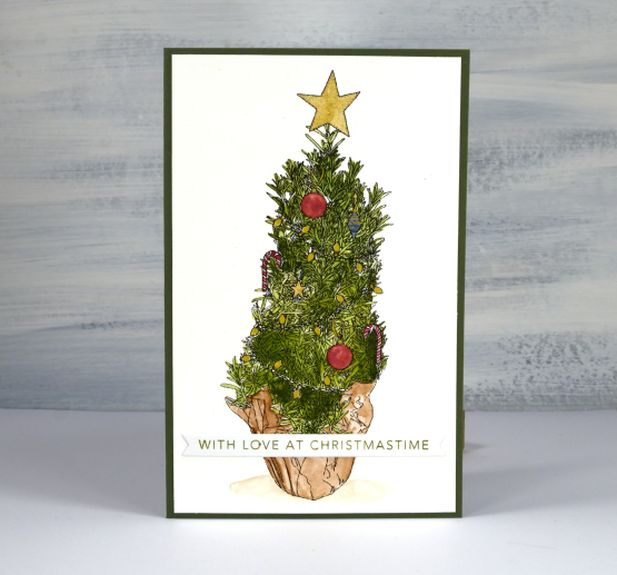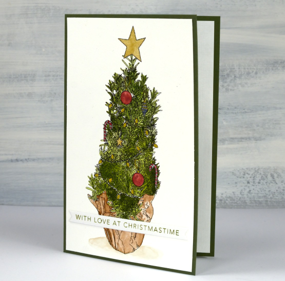 I switched to Finetec pearlescent paints and a gold gel pen to do the decorations so they have a little shimmer and shine to them. I reached into my little box of pre-stamped, pre-cut sentiments and pulled out one to suit the colours and the recipient. It’s a tall skinny tree (a bit like our family) so the card isn’t my usual size. It’s a 6¼” x 4″ olive green card base.