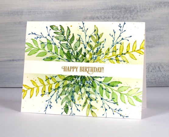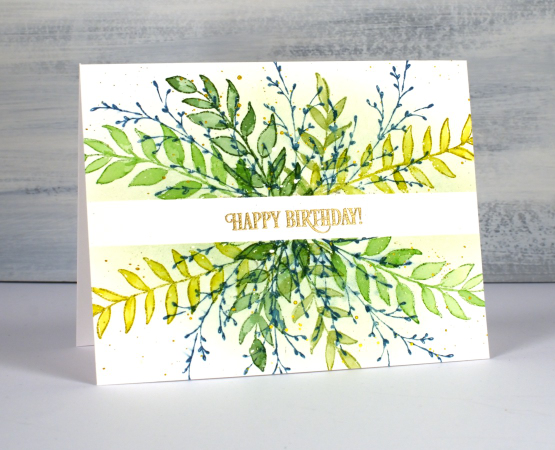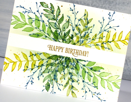 I worked on hot pressed watercolour paper which had some liquid frisket splattered on it. I kept the panel in my stamp positioner but you could easily do this technique without. I placed a strip of washi tape across the panel to mask the centre for a sentiment later. I stamped each leafy spray in one of four greens first with the panel facing one way then again with the panel flipped 180°.
