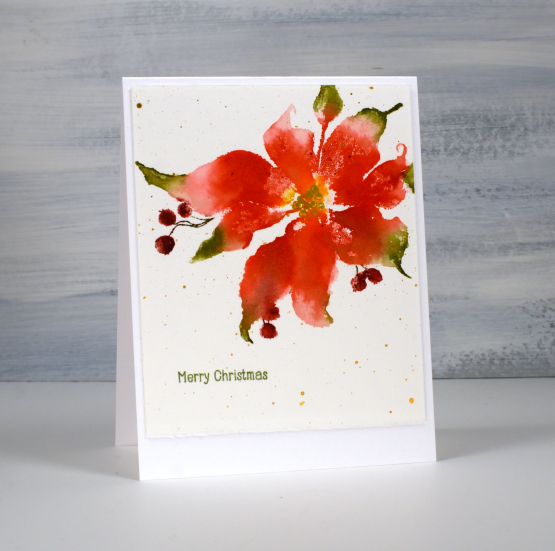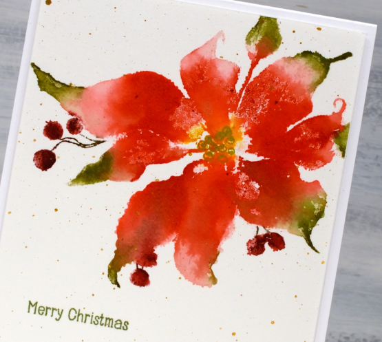 To create this panel I worked in a stamp positioner so I could work on one or two parts of the stamp at a time rather than try and get it right in one go. I used a couple of red distress inks to stamp the petals but wiped ink off the tips so I could ink them with green ink. I gave the stamp a spritz to get the inks moving and after stamping, blended from red to green with a paint brush. I also used some yellow ink in the centre of the poinsettia and later drew the seeds over the top with a gold gel pen.