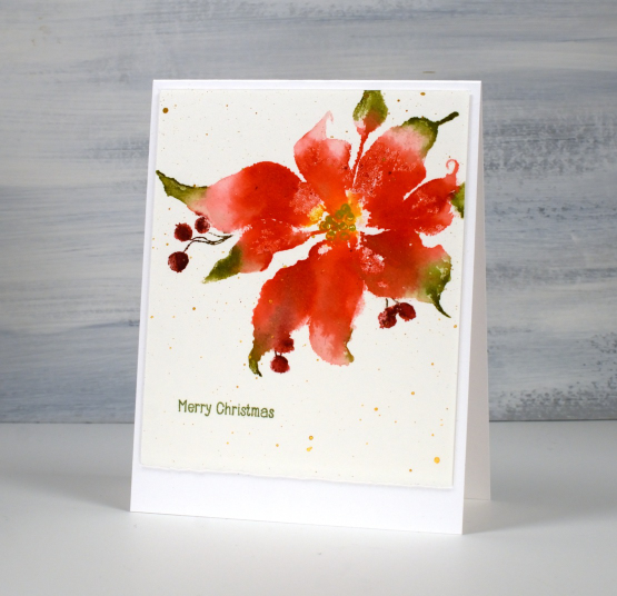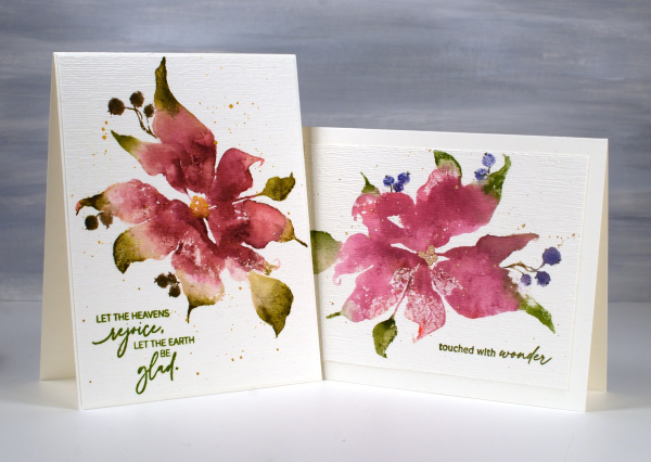 I used the same technique on this second card but used darker inks for leaves, petals and berries. My guess is aged mahogany, forest moss and a dark brown which was possibly made by mixing the first two. (I don’t always take note of my ink colours)