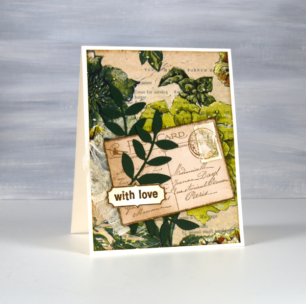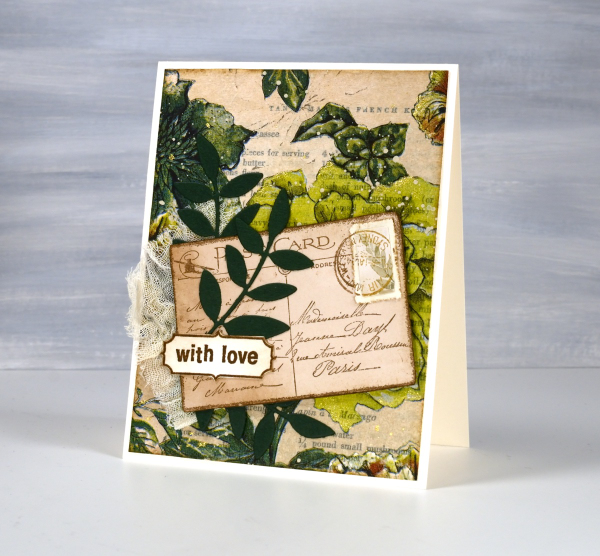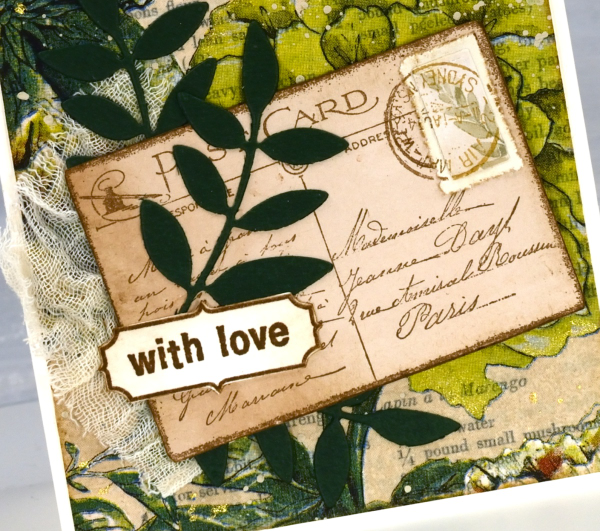 I glued the printed layer of the napkin over book pages to make my main panels and aged the edges with green and brown inks. I created a couple of little vintage postcards with the Paris postcard stamp, a background with the Measuring Tape stamp, sentiments and postmarks all from Darkroom Door.